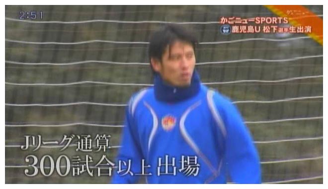 鹿児島ユナイテッドFCミッドフィールダー・松下年宏選手。チーム最年長。右足から繰り出す正確なキックで味方のゴールをアシストします。松下選手は、2002年鹿児島実業から、J1のガンバ大阪に入団。その後FC東京やベガルタ仙台などでプレーし、これまでJリーグ通算300試合以上に出場しています。去年から鹿児島ユナイテッドでプレーする松下選手。今シーズンも精神的な柱として、チームをJ2に導く活躍に期待です。