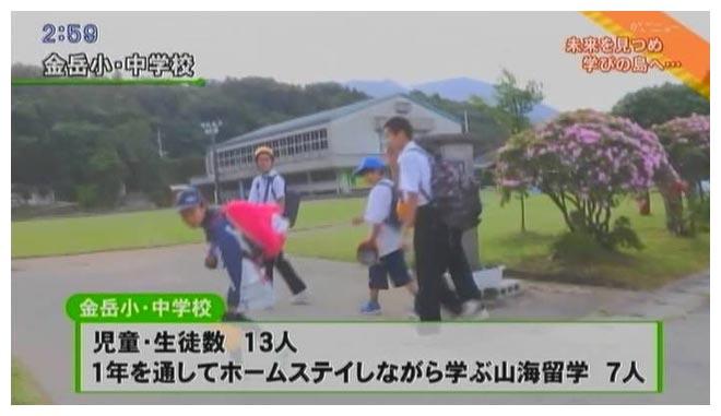 金岳小・中学校は島で唯一の学校です。児童、生徒数は13人。1年を通してホームステイしながら学ぶ散会留学生は7人います。