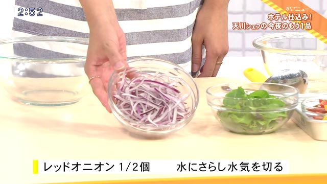 ① レッドオニオンはスライスして、水にさらし、水気をきっておく