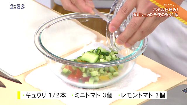 ④ きゅうり・ミニトマト2種類は、それぞれカットして、みょうがと大場はみじん切りにしてボウルに入れ、②のドレッシングをスプーン(大さじ)に3杯位入れ、混ぜ、塩・コショウで味を整える。