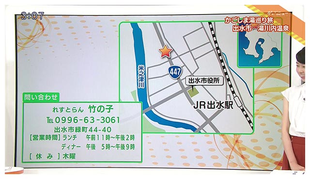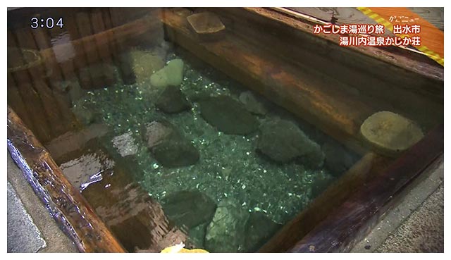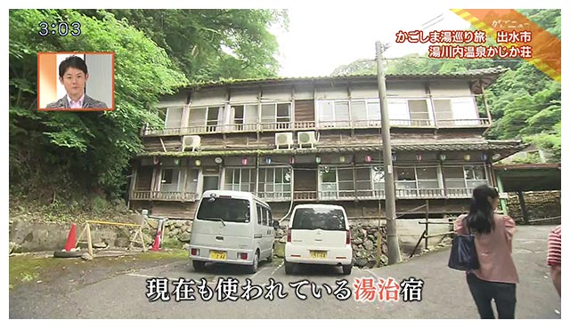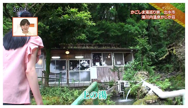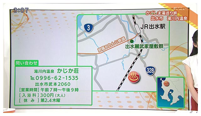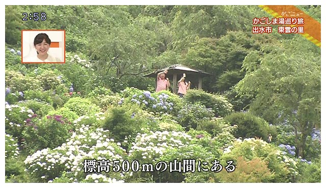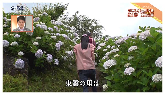 リポータ-のタマリと気象予報士の中俣美咲が町歩きする“かごしま湯巡り旅”、今回は出水市が舞台。ぬるめの湯で知られる「湯川内温泉かじか荘」を訪ねる。深さ1メートル程の湯舟の底から湧き出る源泉、ヒノキの丸太を枕に、つい湯舟の中で居眠りしてしまうほどの名湯でもあった。この他、高台にあるアジサイ園「東雲の里」での遅咲きの花々や「いずみ親子ステーキごはん」という地元グルメも紹介!