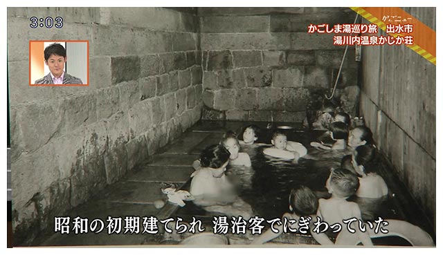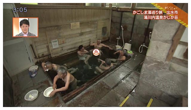 宿の名前の通り、山間の清流に生息するカジカガエルの鳴き声が聞こえる老舗の温泉宿です。タマリさんは下の湯へ。湯船の底をよ~く見ると、岩場の間からこんこんと湧き出るのが源泉です。泉質は単純硫黄泉。そして、中俣さんは上の湯へ。