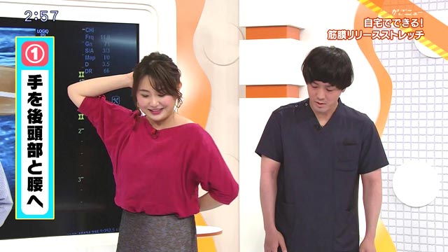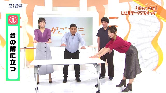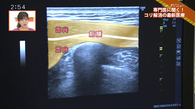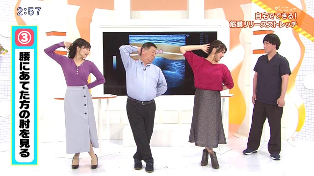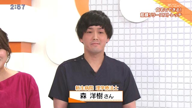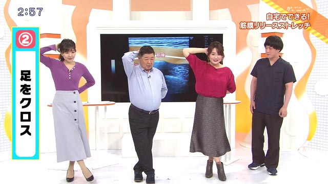 筋膜とはひとつひとつの筋肉をおおっている膜。筋膜と筋膜がくっついてしまっていると肩こりや痛みにつながることが、最新医療で分かってきました。早速筋膜リリースのためのストレッチを教えていただきました。