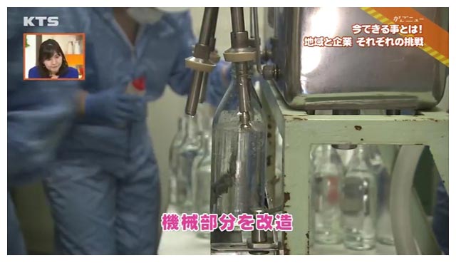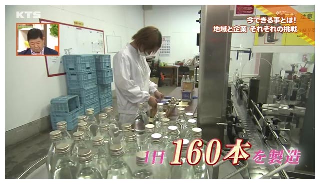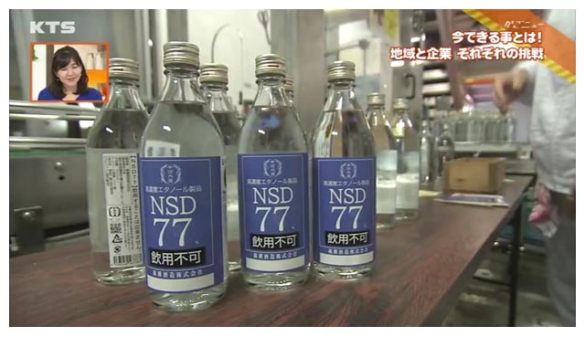 こちらでは、コロナ対策として医療現場や私たちの生活などに必要な消毒液を焼酎メーカーならではの方法で造っています。その消毒液とは、アルコール分77%の高濃度アルコール製品「NSD77」。消毒用エタノールの代替品として、手指消毒に使用できます。多くの方の協力のもと完成した「NSD77」。今では、一日およそ160本を製造しています。