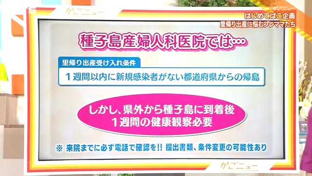 県外からの里帰り出産の中止が、種子島で唯一の産婦人科、種子島産婦人科医院の経営に影響を与えました。5月25日、全国の緊急事態宣言が解除を受け、種子島産婦人科は里帰り出産の受け入れを再開しました。受診前に提出する書類、条件変更の可能性もあるため、事前に電話で問い合わせをお願いします。