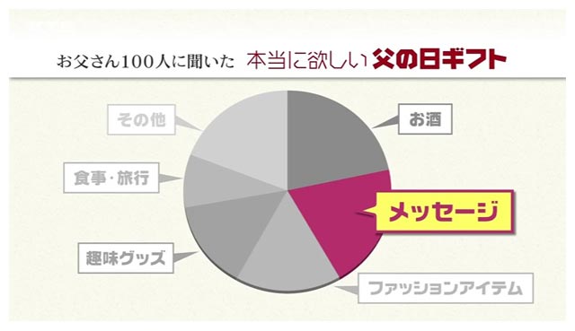 6月21日は、「父の日」。世のお父さんたちが本当に欲しいものとは何なのか?番組では、100人のお父さんに緊急アンケートを実施、おすすめギフトをランキング形式で紹介!趣味のものからお仕事の道具まで幅広いジャンルで人気が高かったものとは何なのか!?これを見ればもうプレゼントに迷わない!