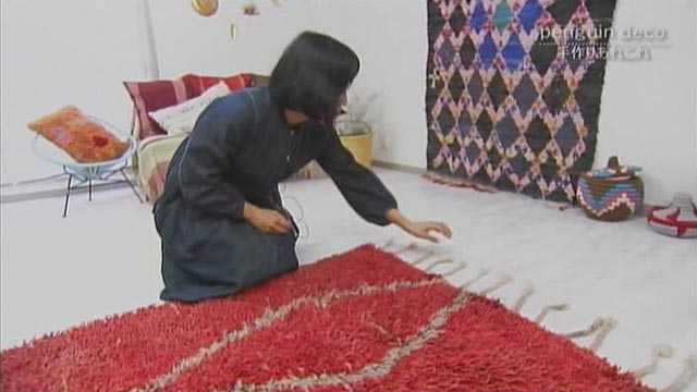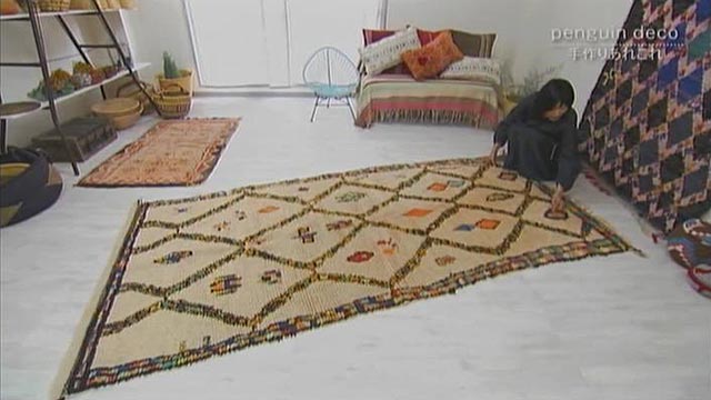 牧園町にあるモロッコラグ専門店のペンギンデコはモロッコラグ専門店。桑水奈美子さんは、独特な色や柄、そして手作りのあったかさに惹かれて現地に行き、少しずつラグを集めて、お店を開くまでになりました。モロッコの地域で、折り方や素材、柄もばらばらですが、共通しているのは、女性が手織りして作るハンドメイドだということです。