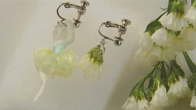 美川アナはアートマ作家のいちだみなみさんにイヤリングを作るためのアドバイスをもらいます。イヤリングのイメージはバレリーナ。花を使い、揺れて踊っている雰囲気を出します。そして、和紙の“透ける”特製をいかして色を重ねていきます。