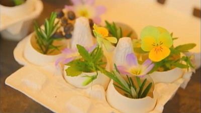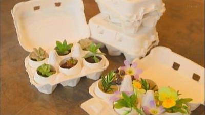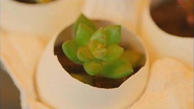 器はなんと、卵の殻。これに多肉植物をいれたり、一輪挿しにしてみたり。