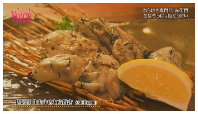 なんと夕方4時からオープンしている居酒屋さん、『わら焼き専門店 赤衛門』。赤衛門は鹿児島でも珍しいわら焼きの専門店。客席から見える風景はまるでひとつのショーの様。肉より魚派の店長の赤塚さんは使うわらも鹿屋産というこだわりっぷりです。わら焼きは、およそ800度の熱で一気に火を通します。わらで焼くことでより香ばしい仕上がりになるそうです。こうして出来上がった魚介のわら焼きは、下味がついているからそのままでもおいしくいただけます赤衛門名物の『枕崎産 カツオのわら焼き』はわら焼きならではの香ばしさとカツオの甘みが広がる一品。見た目はまるでステーキ肉の『本マグロのほほ肉のわら焼き』は口に入れると、とろけてしまうほど柔らかいです。『広島産の生カキのわら焼き』はレモンをちょっと搾ってさわやかにいただきます。