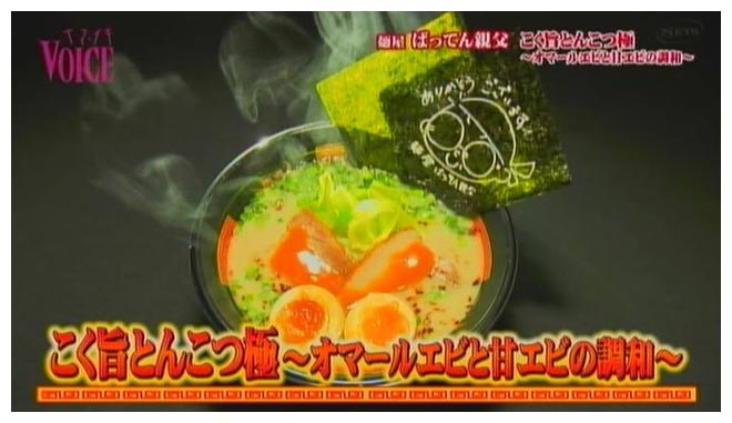 ばってん親父は店の人気メニュー「海老香る こく旨とんこつ」を進化させた、「こく旨とんこつ極~オマールエビと甘エビの調和(ハーモニー)~」。甘海老のうま味を加えたとんこつスープとオマールエビのソースがかかった、厚切りのチャーシュー。オーナーの似顔絵画が描かれた大判海苔もポイント!