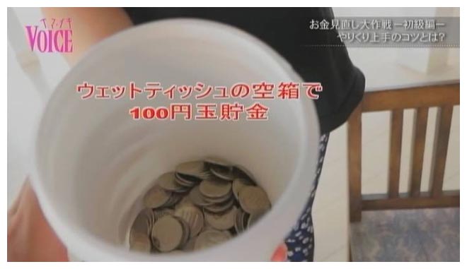 新幹線で使えるカードを使用してポイント貯め。そして500円玉貯金。ウェットティッシュの空箱で100円玉貯金も!この小銭貯金を自分へのボーナスにして大きな買い物をするんだって。去年は20万ぐらいのダウン買ったんだそうです。一生着られる物、無駄な買い物はしないってことです。