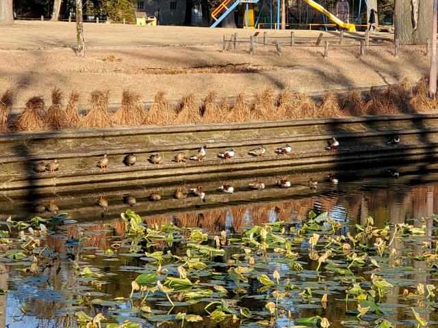 一列にお行儀よく並んでひなたぼっこしていました。