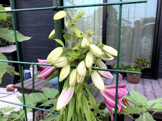 この百合の花、1つの球根から茎が上のほうになると途中で3つに分かれています。それも驚きですが、それ以上の驚きが!じつは蕾の数が28個もあるんです。しかも最初は31個あったんです!3つ枯れてしまいました。